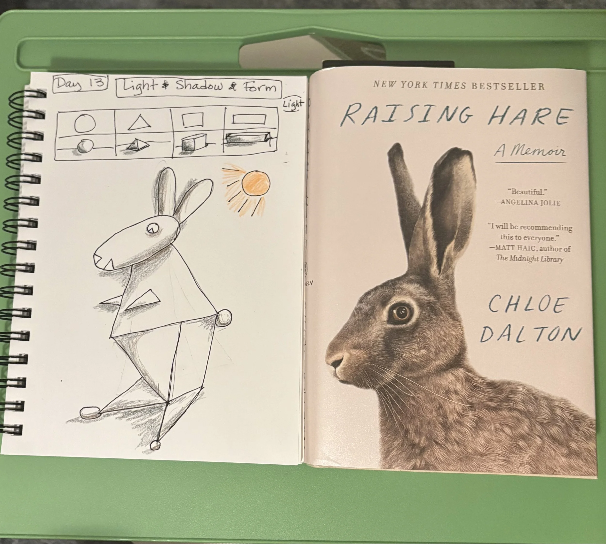 But then - oh no - things started to get serious. Lines, shapes, light and shadow. Now draw an animal with the shapes we’d practiced. That’s when I really started to get nervous. I heard all the I can’t’s coming back. Here is my hare made of the shapes I practiced. (I’ll come back to the book later.)