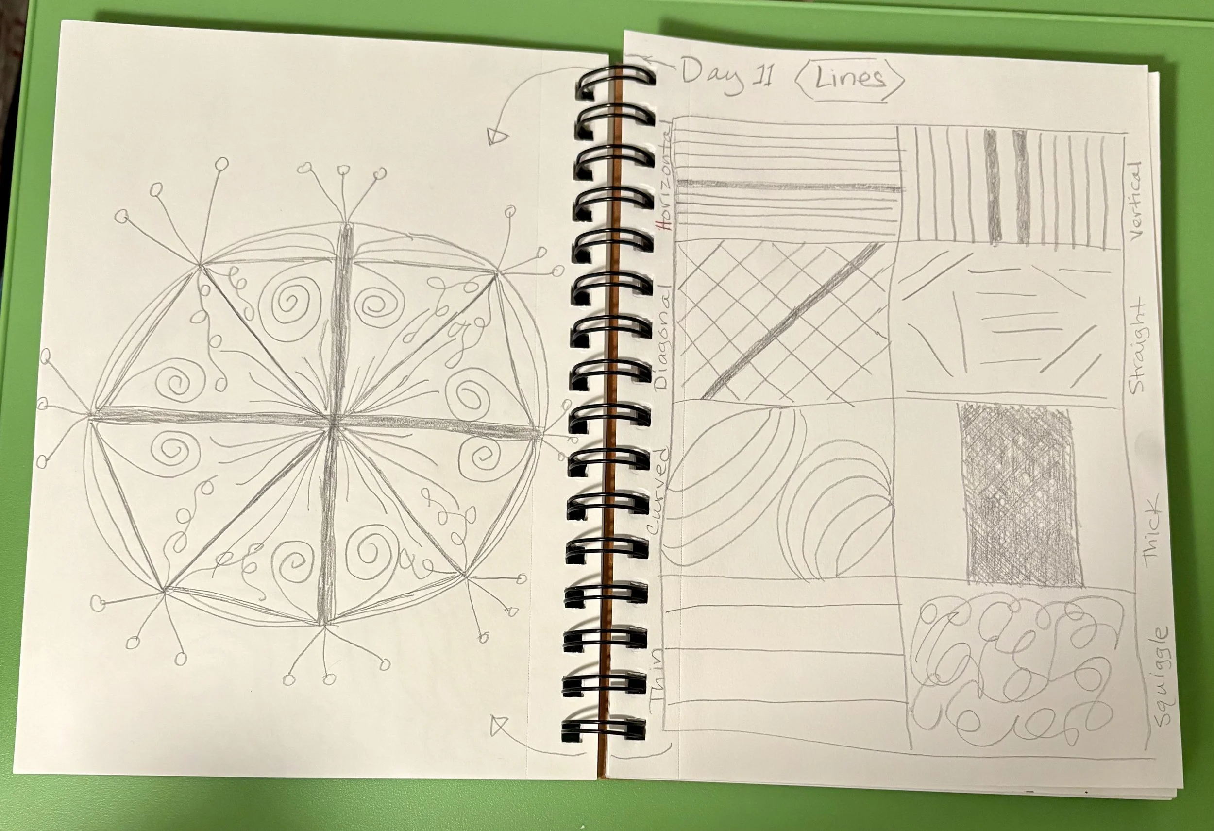 Then Day 2 we worked on something familiar. Spirals! How many spirals had I drawn in the margins of my notebooks during boring lectures? I knew how to do that!